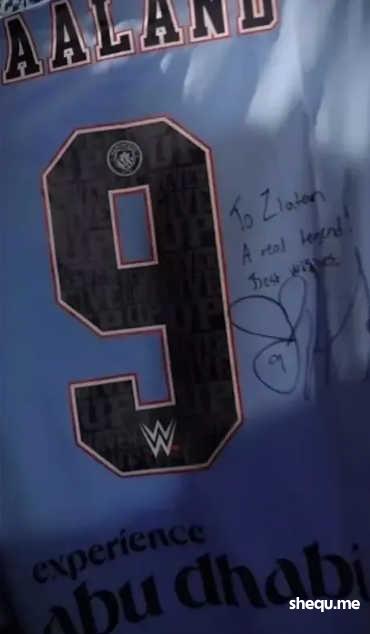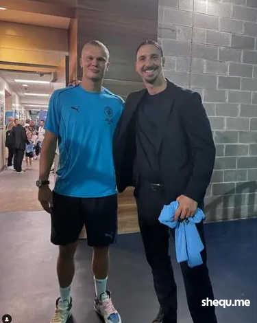 从照片看,伊布手上拿着哈兰德给他送上签名的曼城球衣。